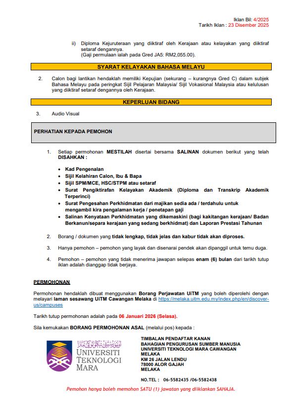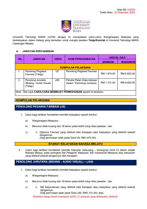 Iklan Jawatan Universiti Teknologi MARA Cawangan Melaka