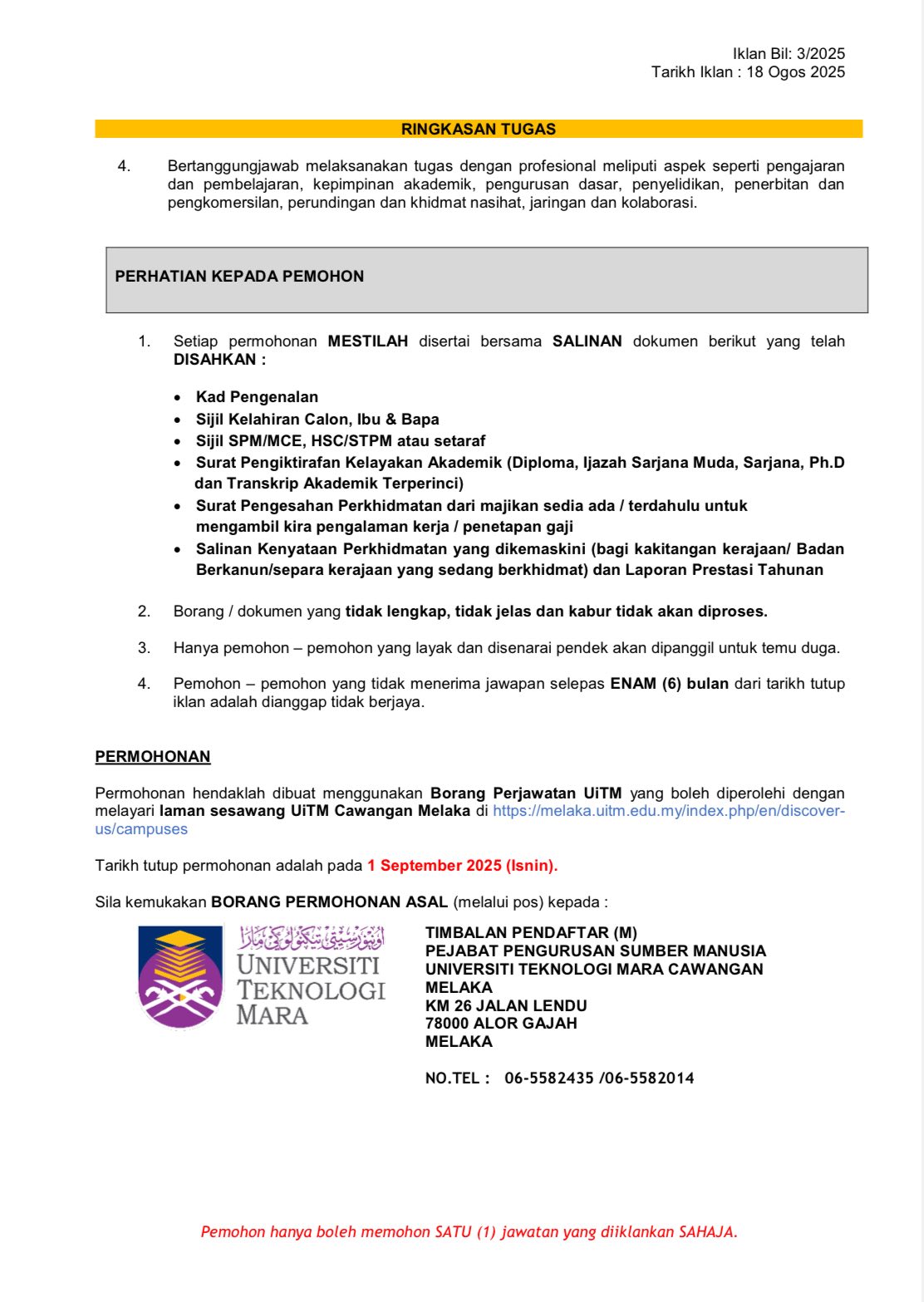 Iklan Jawatan Universiti Teknologi MARA (UiTM) Cawangan Melaka