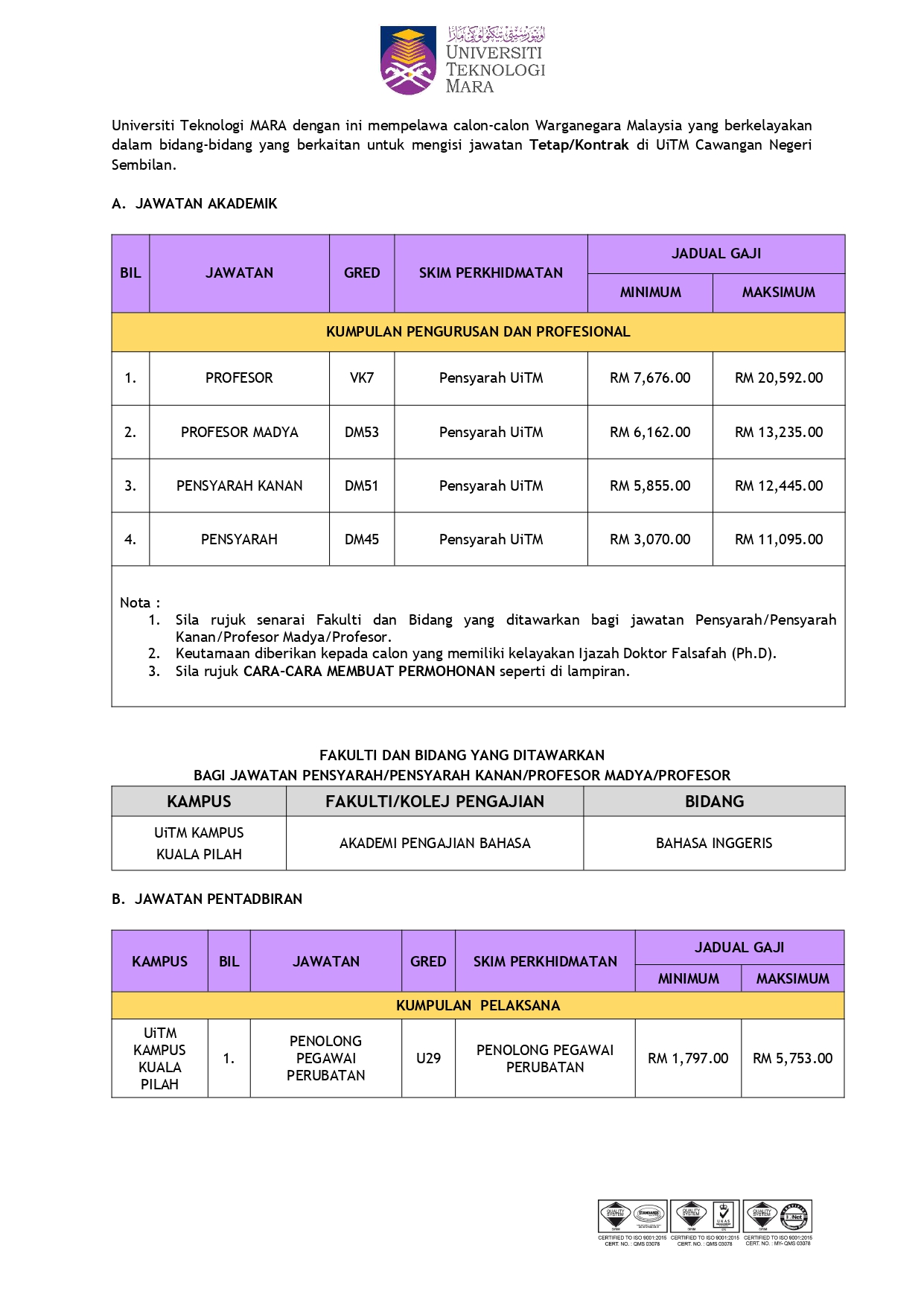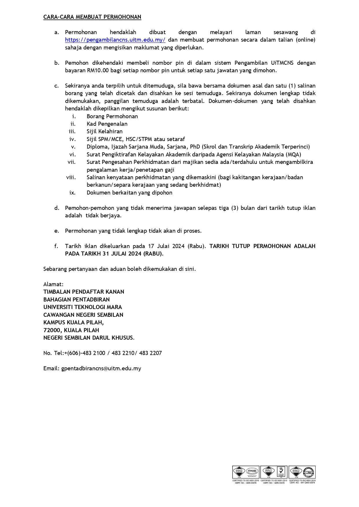 Iklan Jawatan Universiti Teknologi MARA (UiTM) Cawangan Negeri Sembilan IKLAN PENUH JAWATAN PAUTAN PERMOHONAN