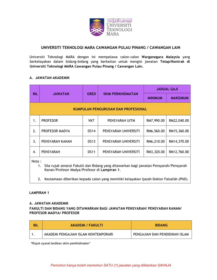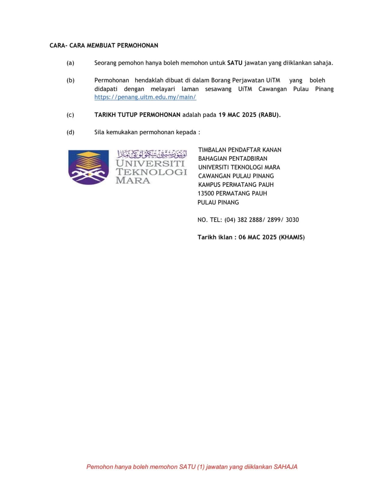 Iklan Jawatan Universiti Teknologi Mara (UiTM) Cawangan Pulau Pinang Kampus Permatang Pauh BORANG PERMOHONAN