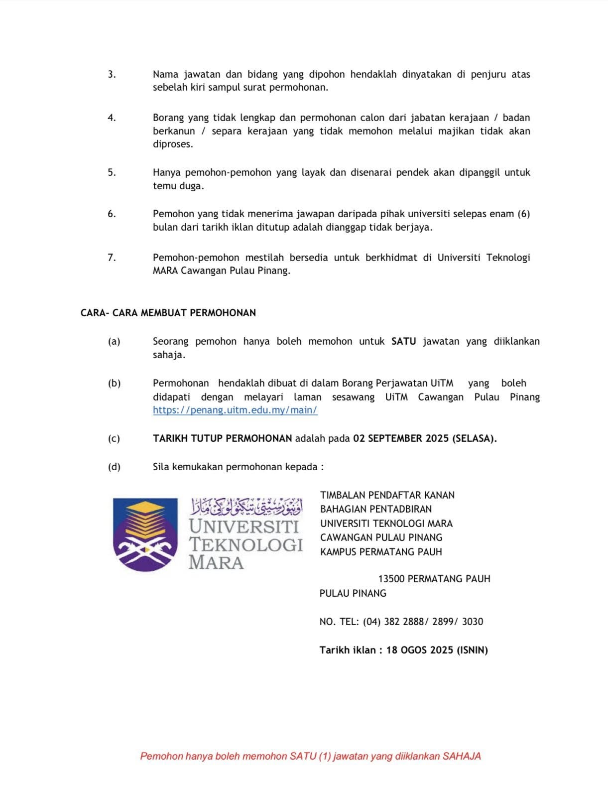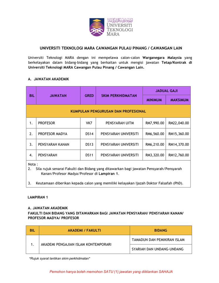 Iklan Jawatan Universiti Teknologi Mara (UiTM) Cawangan Pulau Pinang Kampus Permatang Pauh BORANG PERMOHONAN
