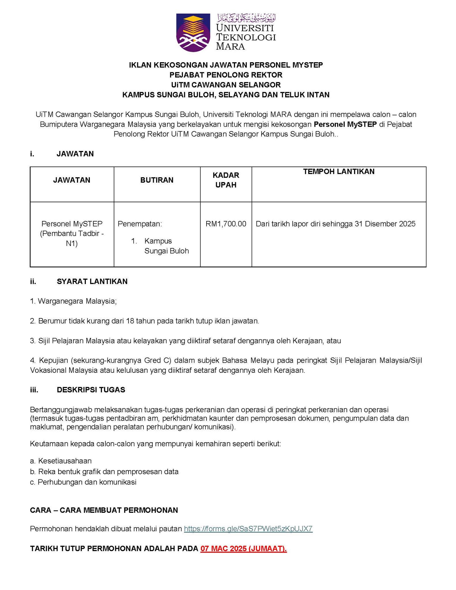 Iklan Jawatan Universiti Teknologi MARA (UiTM) Selangor