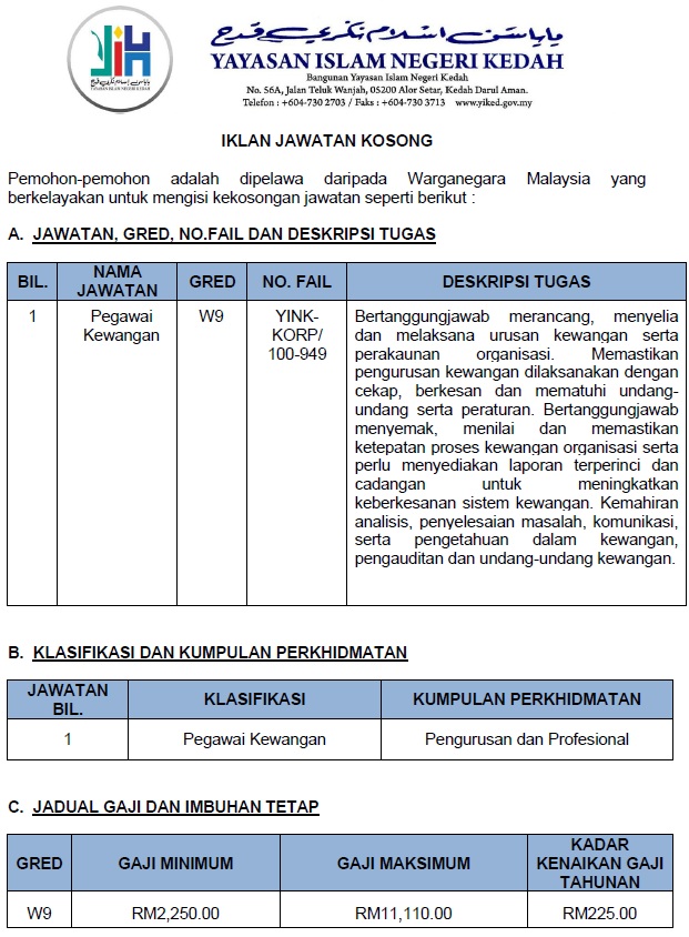 Iklan Jawatan Yayasan Islam Negeri Kedah