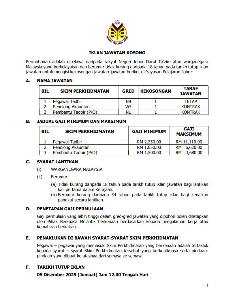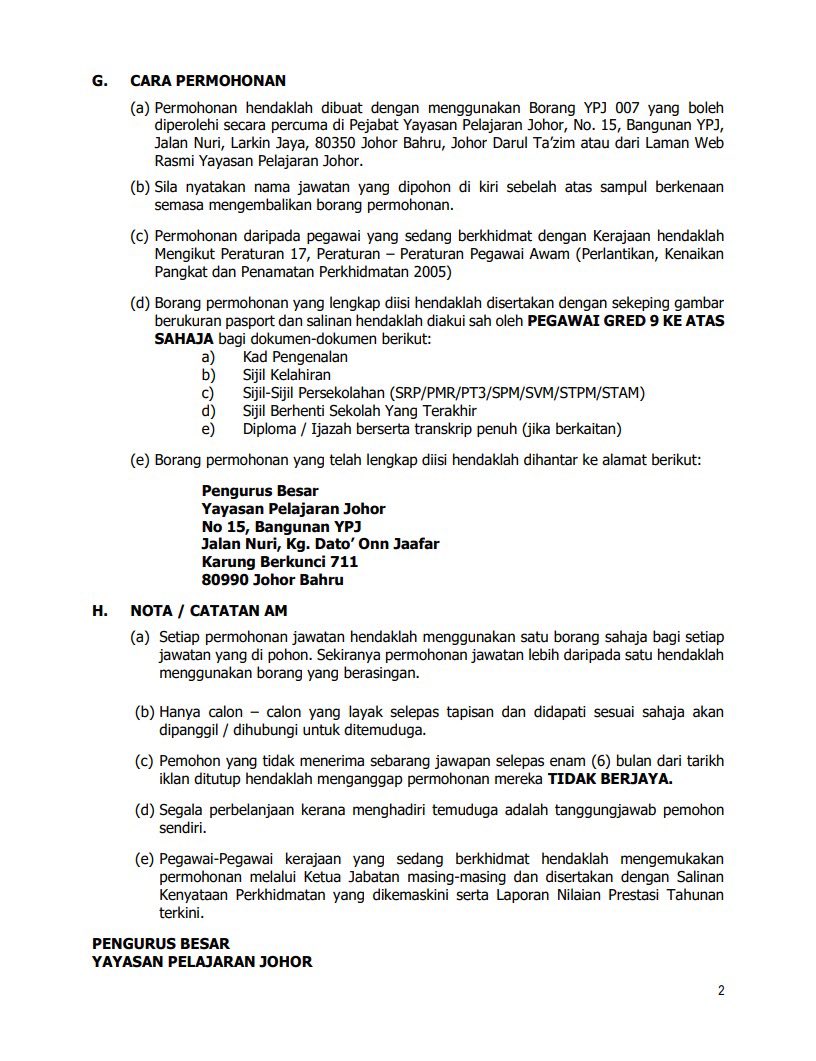 Iklan Jawatan Yayasan Pelajaran Johor (YPJ)