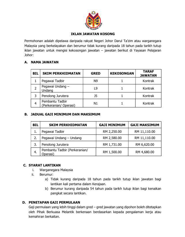 Iklan Jawatan Yayasan Pelajaran Johor (YPJ)