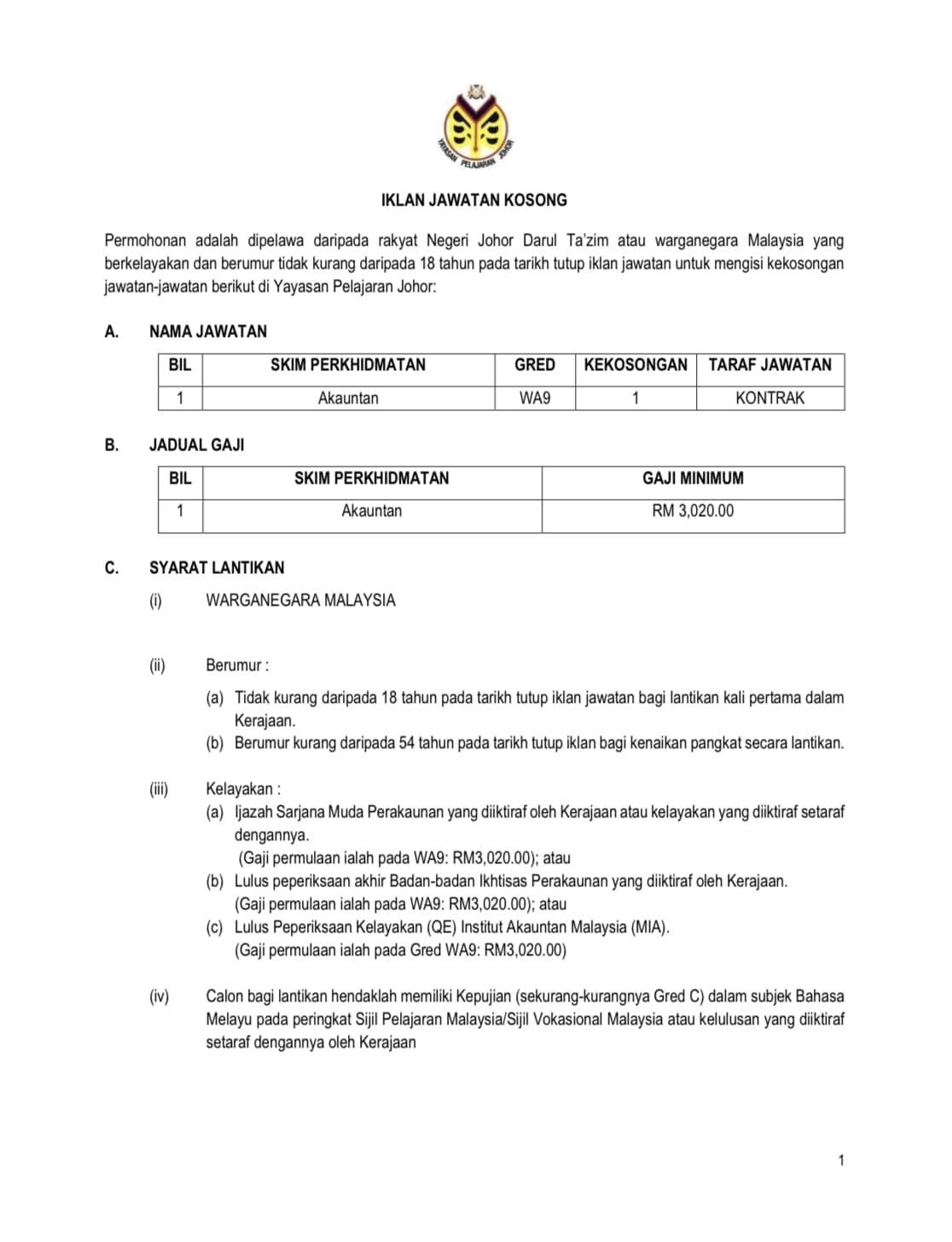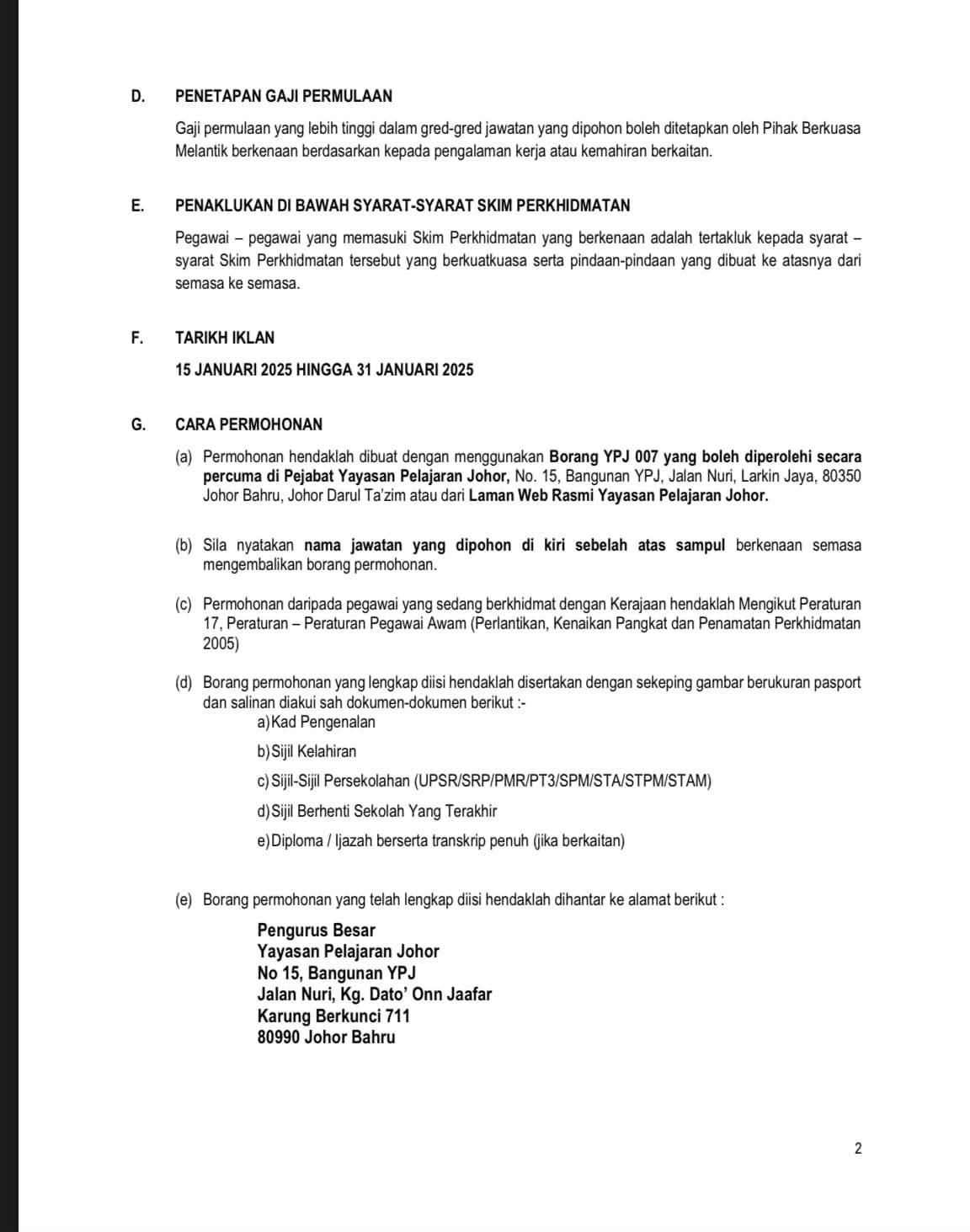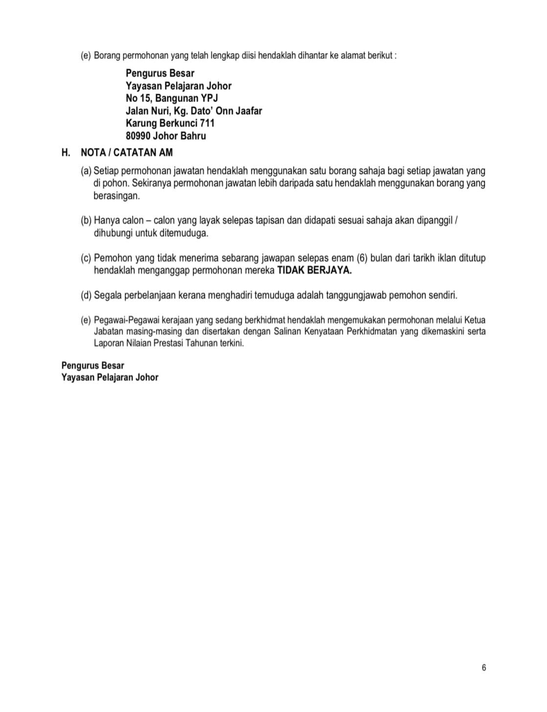 Iklan Jawatan Yayasan Pelajaran Johor (YPJ)