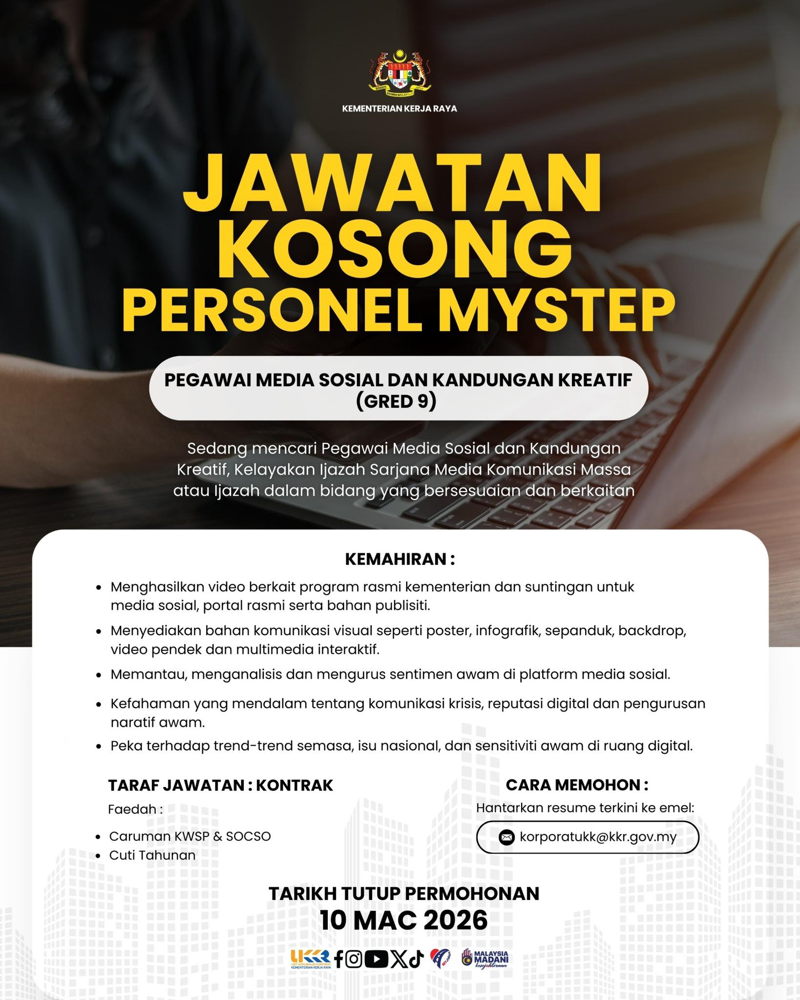 IKLAN JAWTAN KEMENTERIAN KERJA RAYA (KKR) ~ KEKOSONGAN JAWATAN PERSONEL