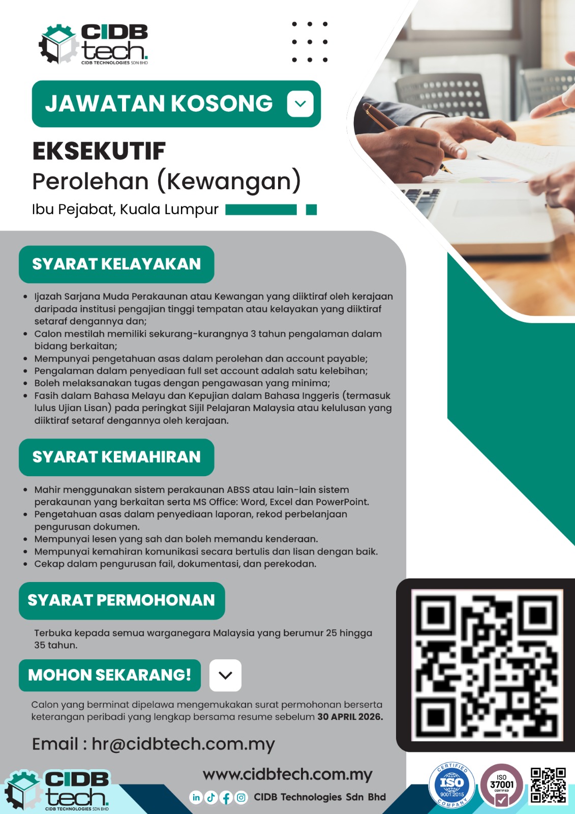 Iklan Kini CIDB Technologies Sdn Bhd ~ Kekosongan Jawatan Eksekutif (Perolehan)