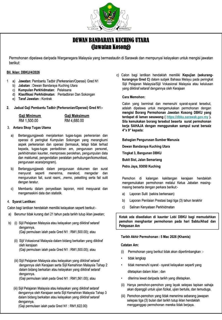 Iklan Kini Dewan Bandaraya Kuching Utara (DBKU) ~ Jawatan Kosong Pembantu Tadbir