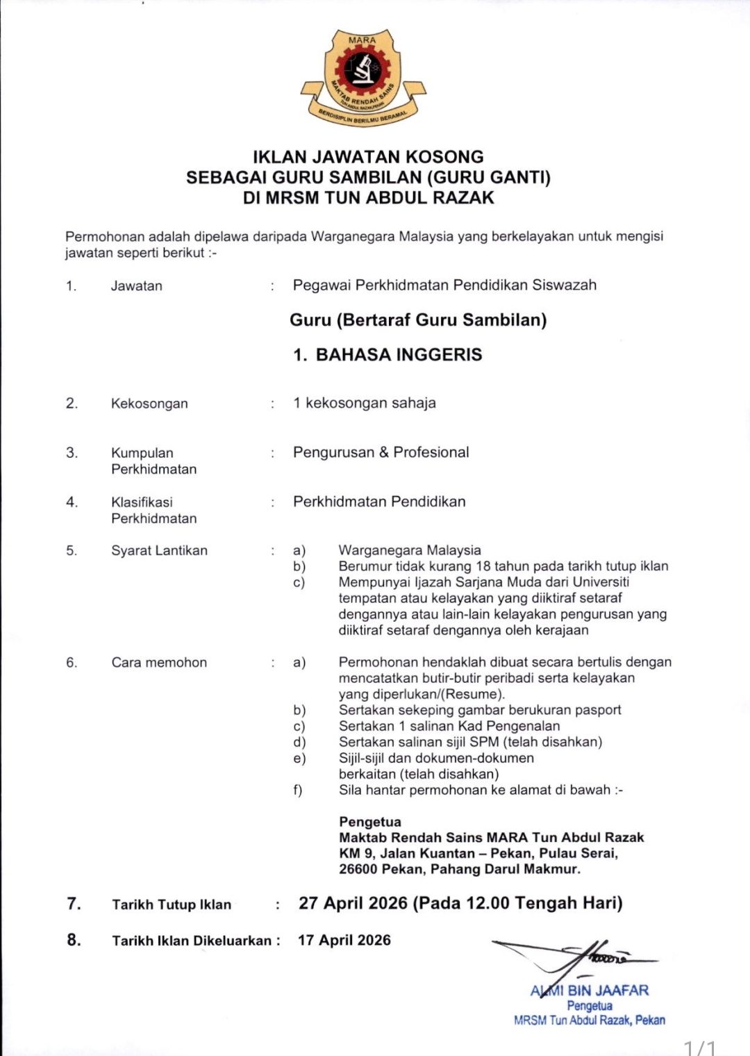 Iklan Kini Guru Sambilan MRSM Tun Abdul Razak