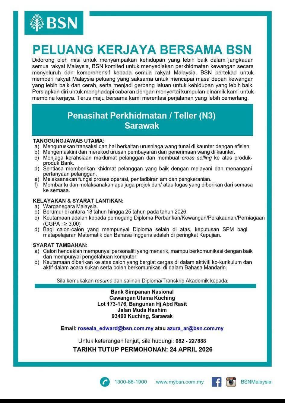 Iklan Kini Jawatan Bank Simpanan Nasional (BSN) ~ Kekosongan Jawatan Penasihat Perkhidmatan / Teller (N3)