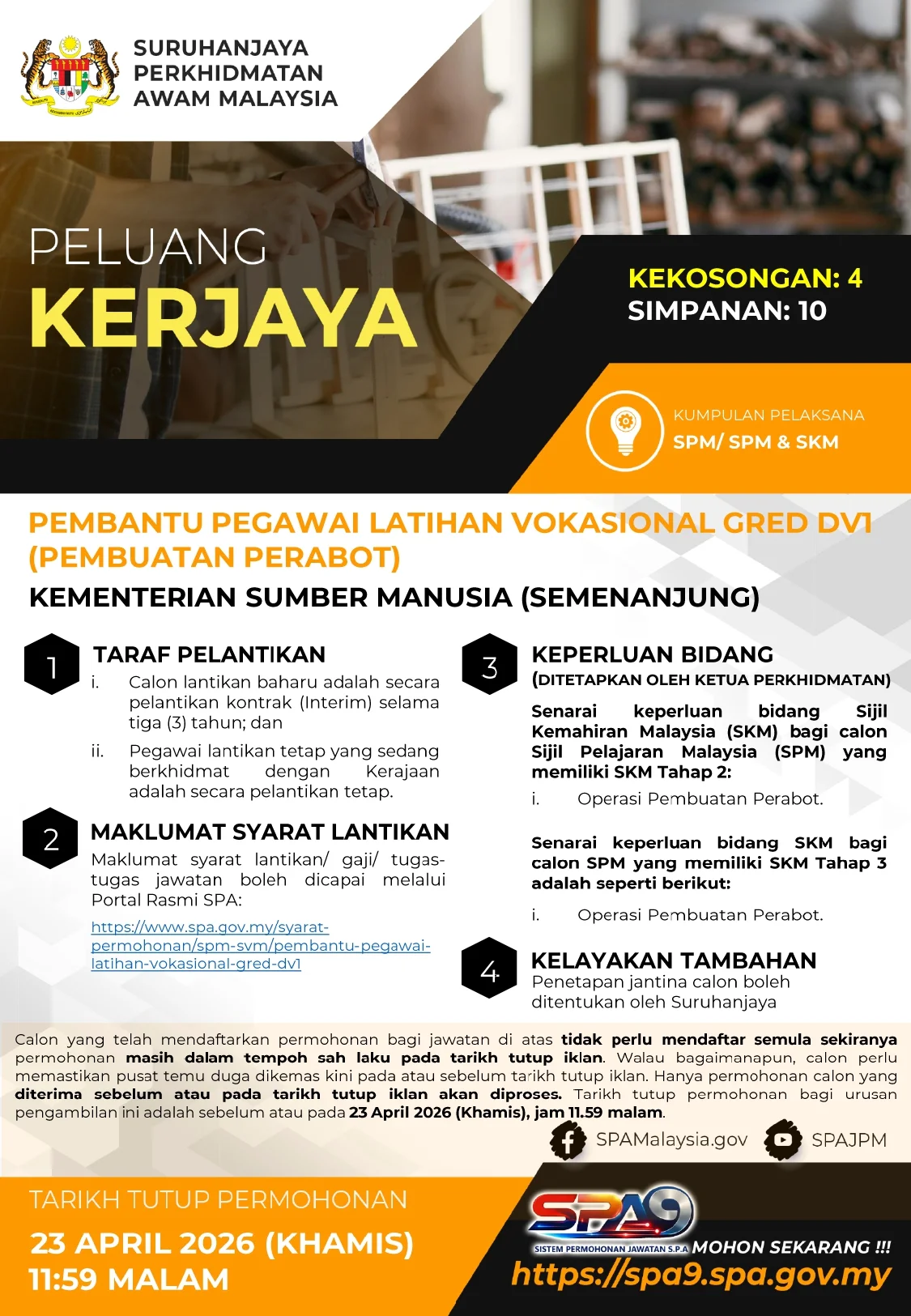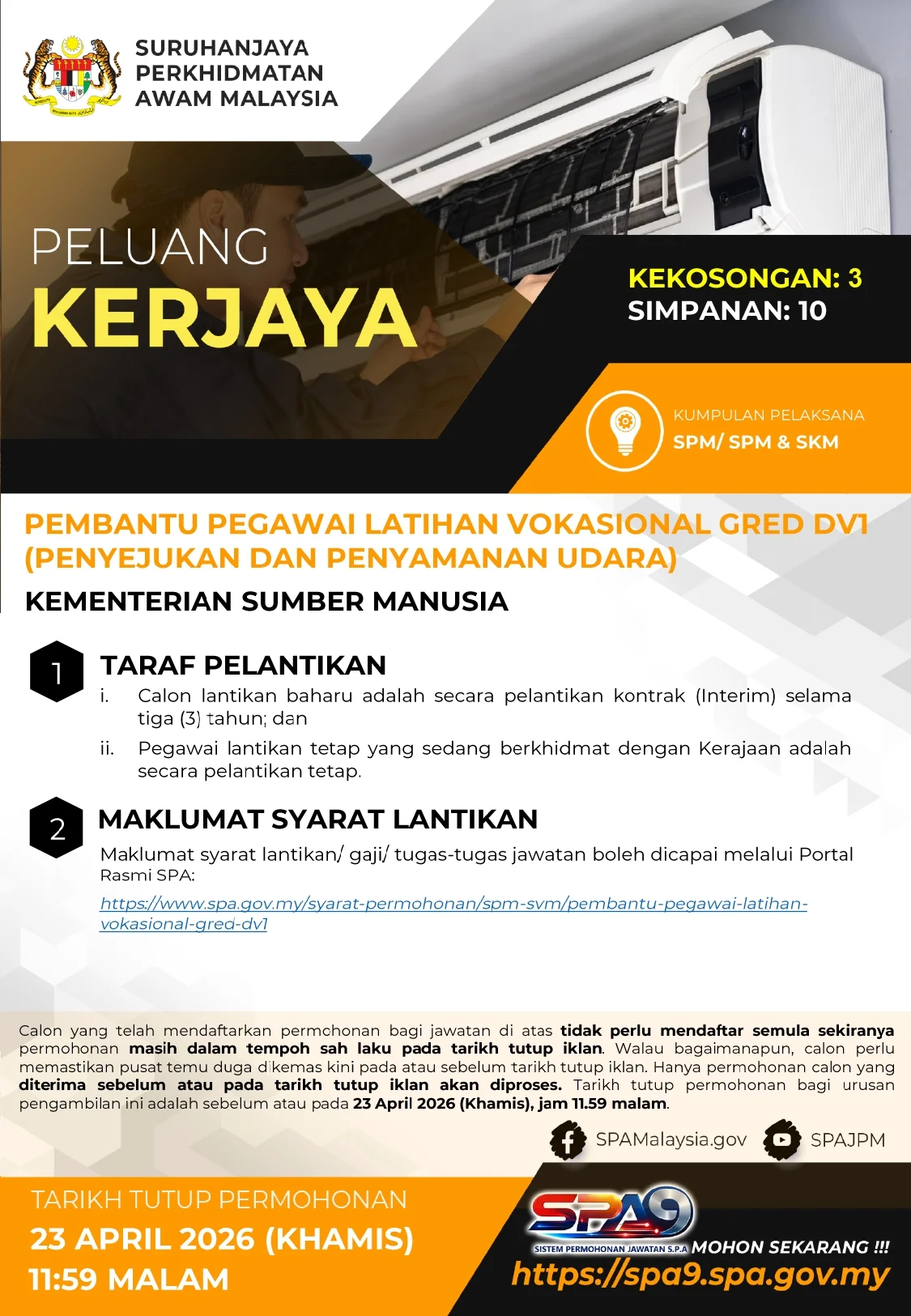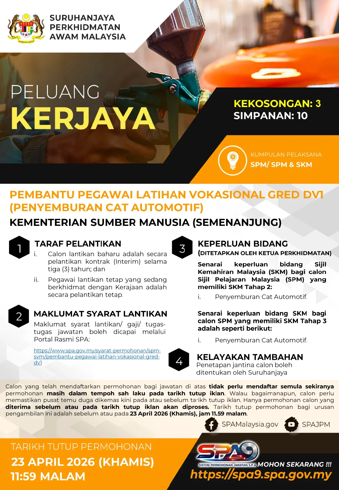 Iklan Kini Jawatan Kementerian Sumber Manusia ~ Jawatan Kosong Pembantu Pegawai Latihan Vokasional Gred DV1 (Penyemburan Cat Automotif) , Pembantu Pegawai Latihan Vokasional Gred DV1 (Penyejukan Dan Penyamanan Udara) , Pembantu Pegawai Latihan Vokasional Gred DV1 (Pembuatan Perabot)