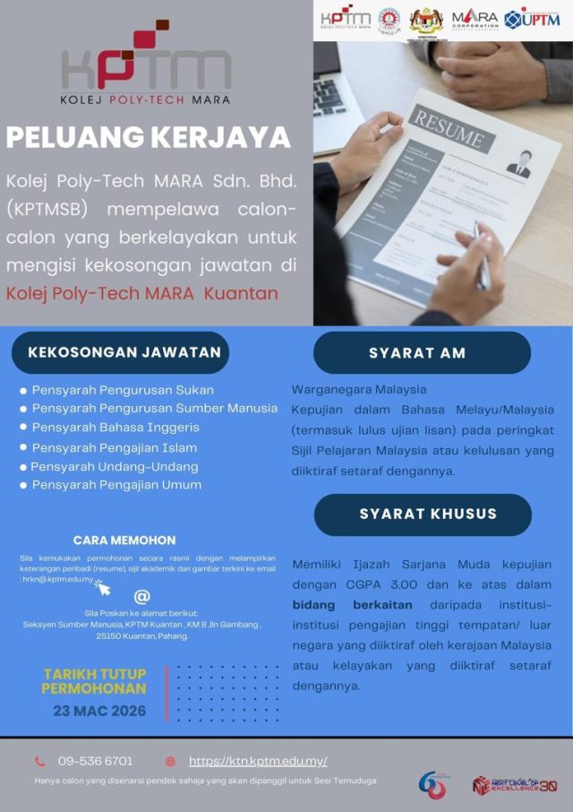 Iklan Kini Jawatan Kolej Poly-Tech MARA (KPTM) Kuantan ~ Kekosongan Jawatan Pensyarah Klik Iklan Jawatan Disini