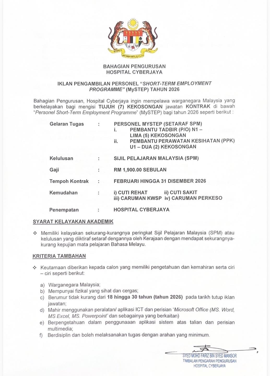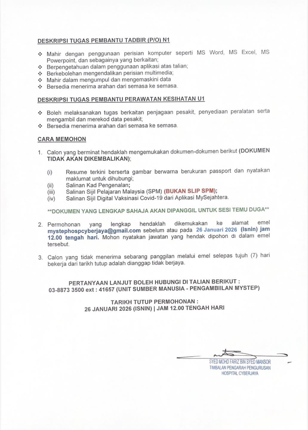 Iklan Kini Jawatan Kosong Hospital Cyberjaya