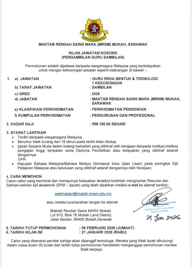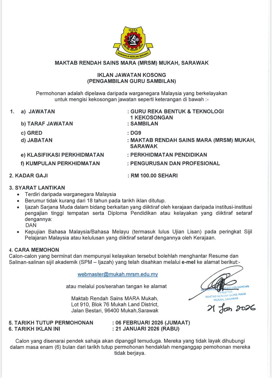 Iklan Kini Jawatan Maktab Rendah Sains MARA Mukah