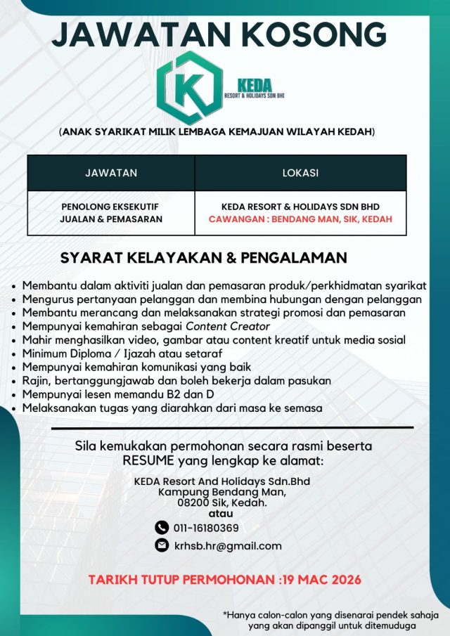 Iklan Kini Keda Resort And Holidays ~ Kekosongan Jawatan Penolong Eksekutif Jualan dan Pemasaran Klik Iklan Jawatan Disini