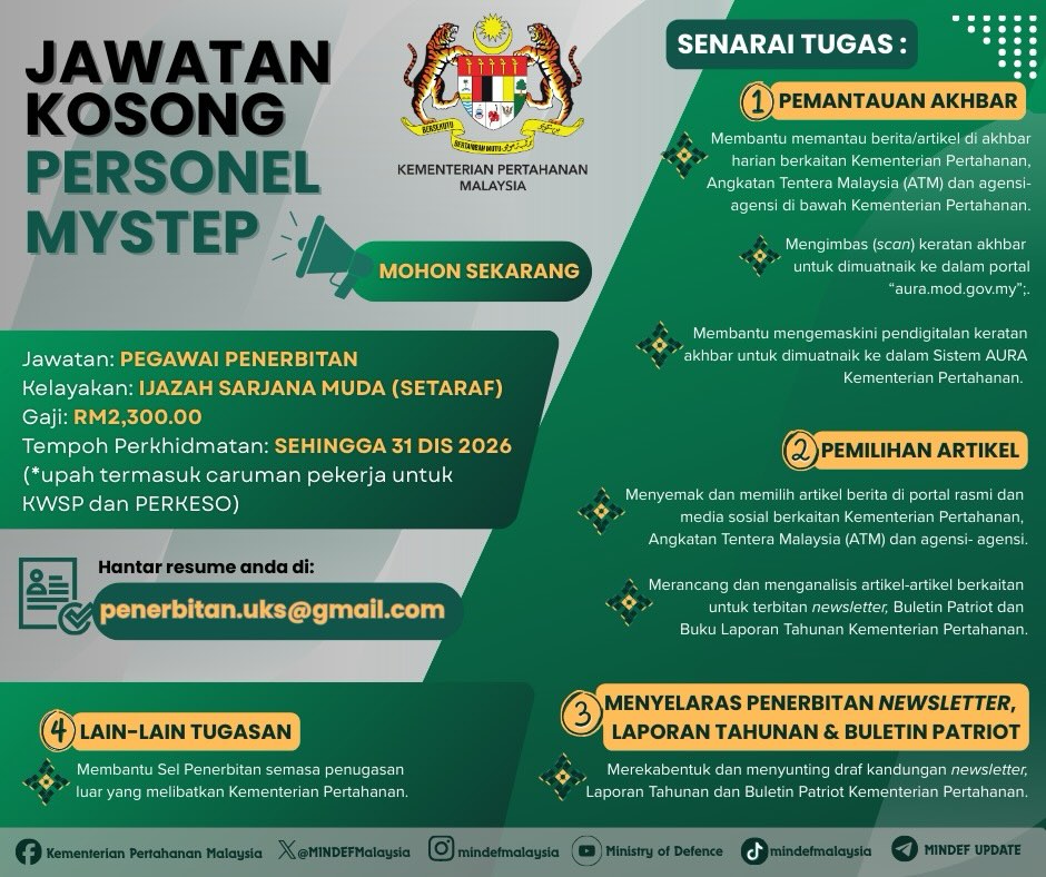 Iklan Kini Kementerian Pertahanan Malaysia (MINDEF) ~ Jawatan Kosong Personel MySTEP