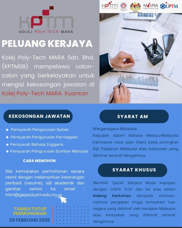 Iklan Kini Kolej Poly-Tech MARA (KPTM) Kuantan ~ Kekosongan Jawatan Pensyarah Klik Iklan Jawatan Disini