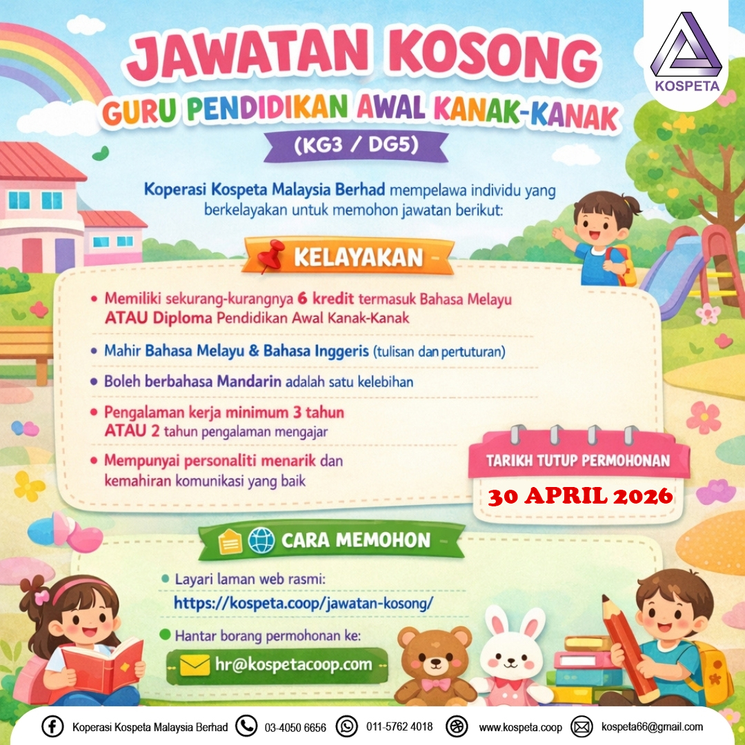Iklan Kini Koperasi KOSPETA Malaysia Berhad ~ Jawatan Kosong Guru Pendidikan Awal Kanak-Kanak (KG3/DG5) Iklan Jawatan Disini