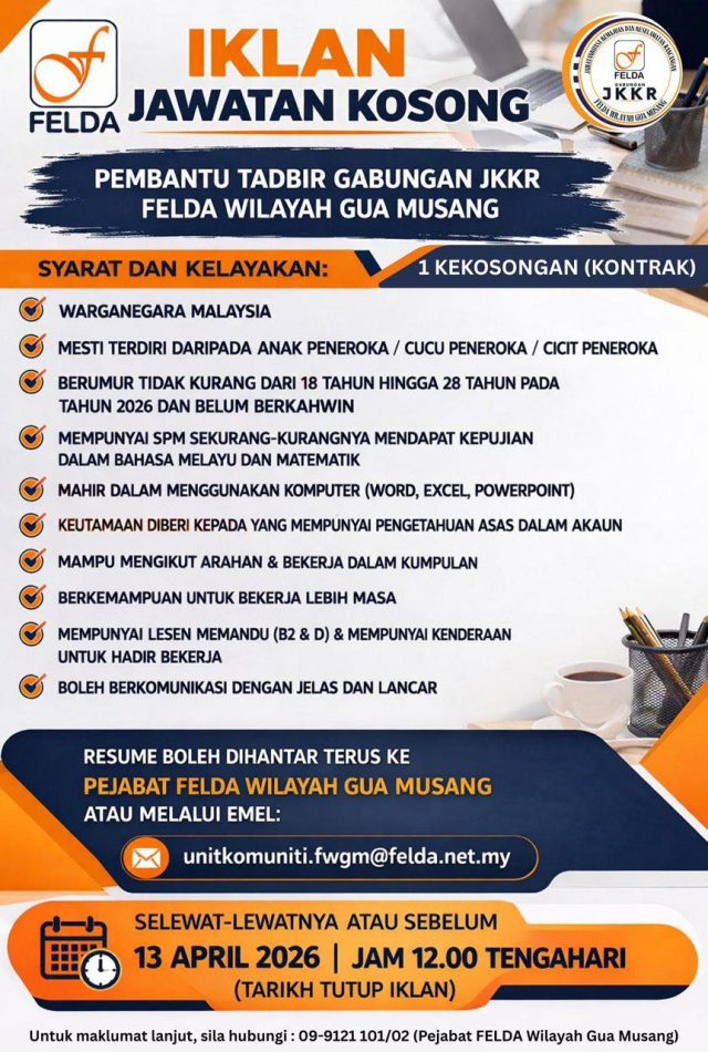 Iklan Kini Lembaga Kemajuan Tanah Persekutuan (FELDA) ~ Kekosongan Jawatan Pembantu Tadbir Gabungan JKKR
