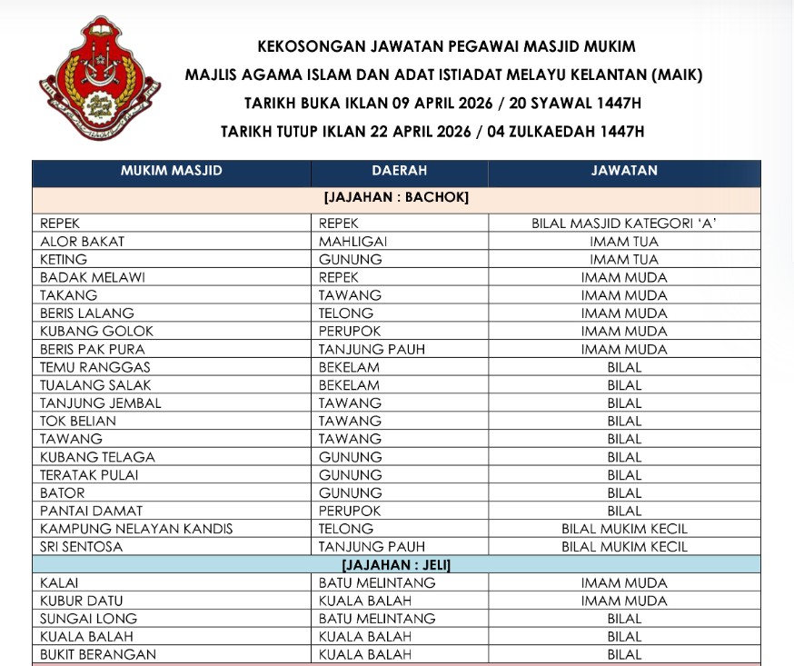 Iklan Kini Majlis Agama Islam dan Adat Istiadat Melayu Kelantan (MAIK) ~ Pegawai Masjid Mukim