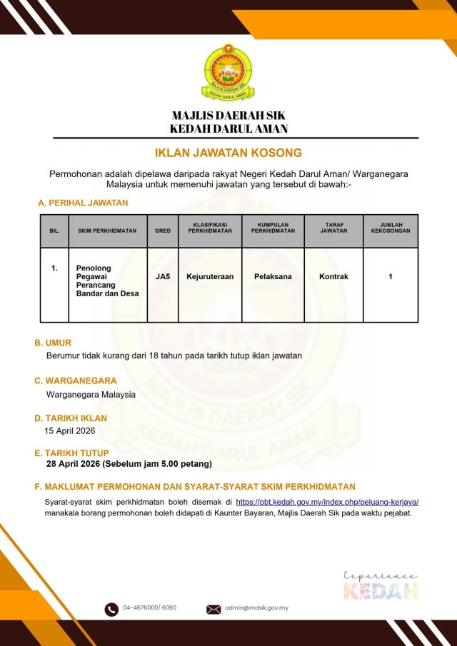 Iklan Kini Majlis Daerah Sik ~ Jawatan Kosong Penolong Pegawai Perancang Bandar Dan Desa