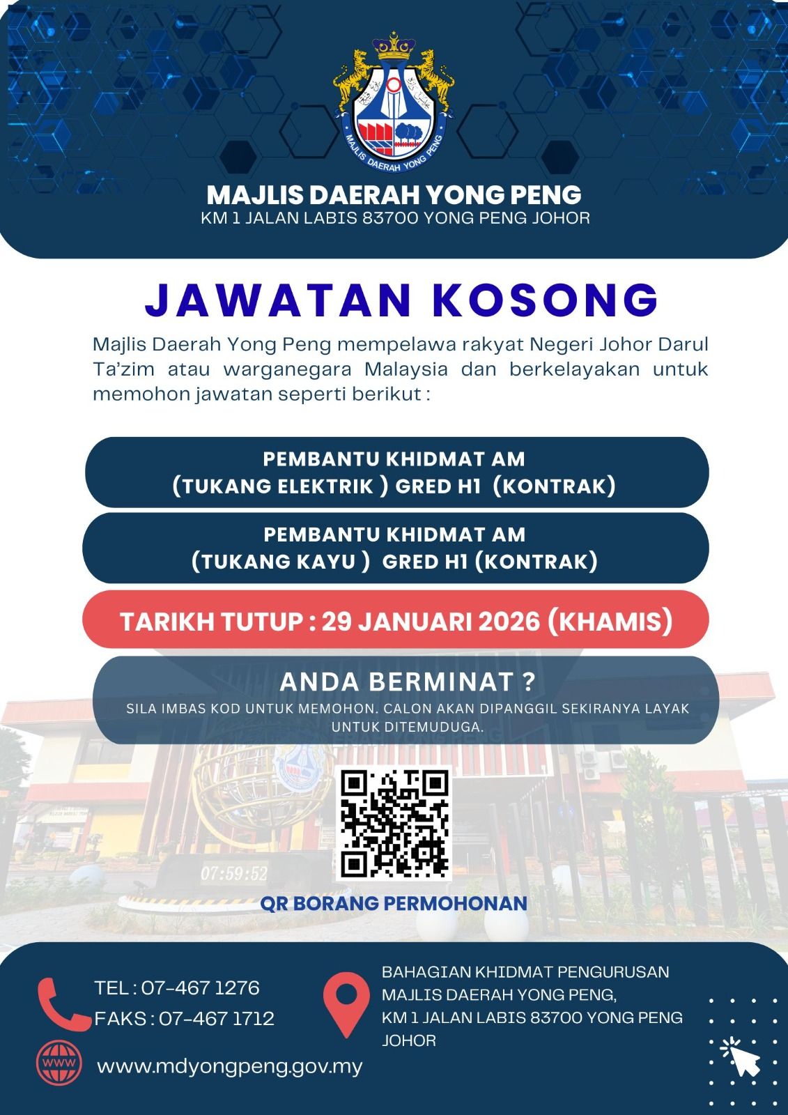 Iklan Kini Majlis Daerah Yong Peng (MDYP) ~ Jawatan Kosong Pembantu Khidmat Am Klik Iklan Jawatan Disini