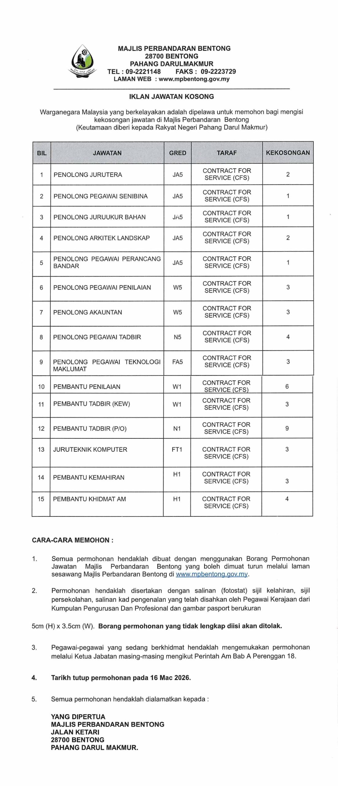Iklan Kini Majlis Perbandaran Bentong ~ Pelbagai Jawatan Kosong