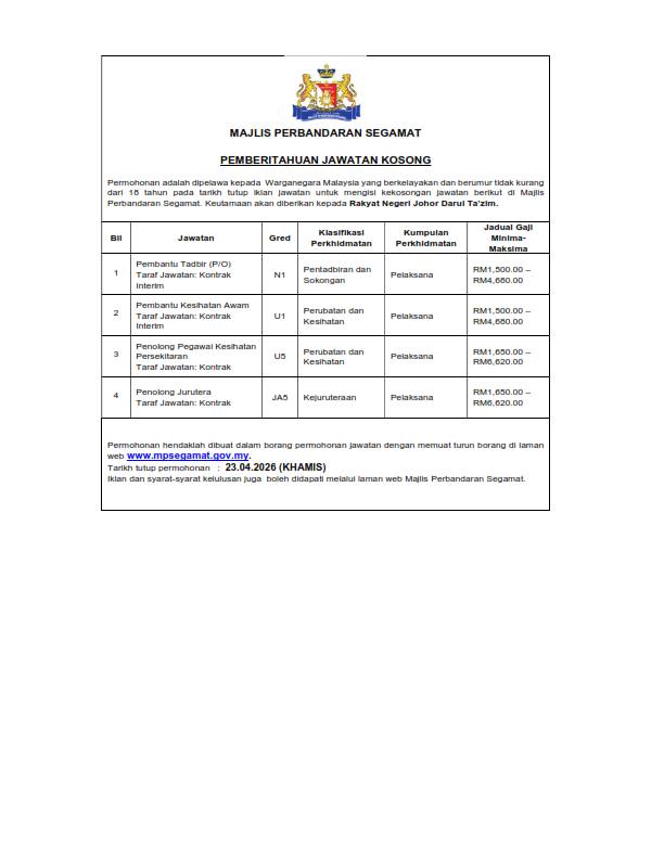 Iklan Kini Majlis Perbandaran Segamat ~ Pelbagai Kekosongan Jawatan