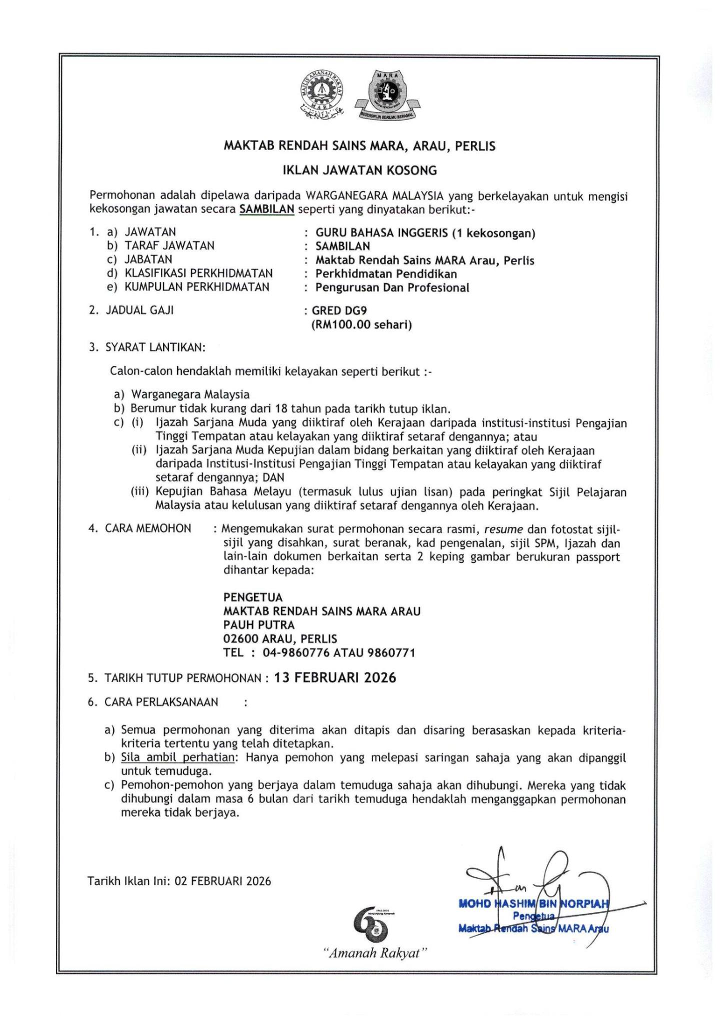 Iklan Kini Maktab Rendah Sains MARA (MRSM) Arau ~ Kekosongan Jawatan Guru