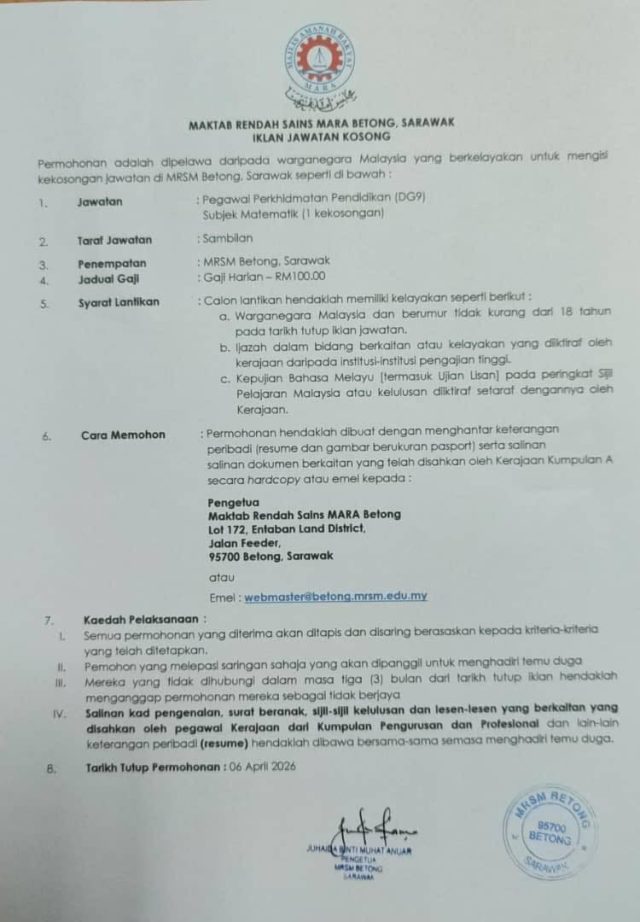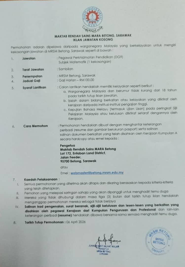 Iklan Kini Maktab Rendah Sains MARA (MRSM) Betong ~ Jawatan Kosong Guru Matematik Gred DG9 (Sambilan) Klik Iklan Jawatan Disini
