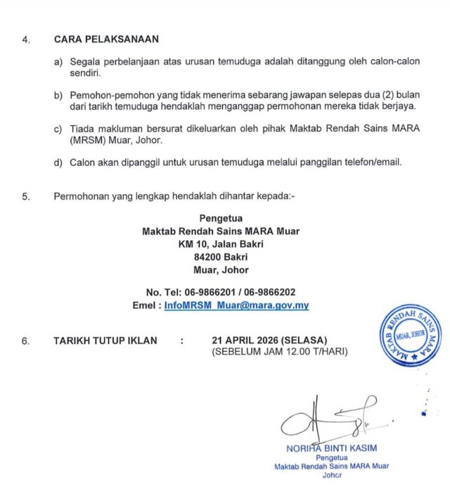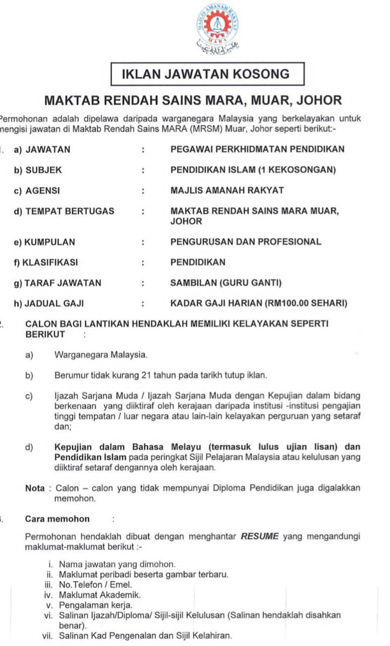 Iklan Kini Maktab Rendah Sains MARA (MRSM) Muar ~ Jawatan Kosong Guru Sambilan