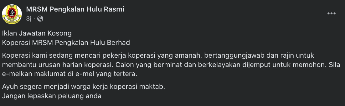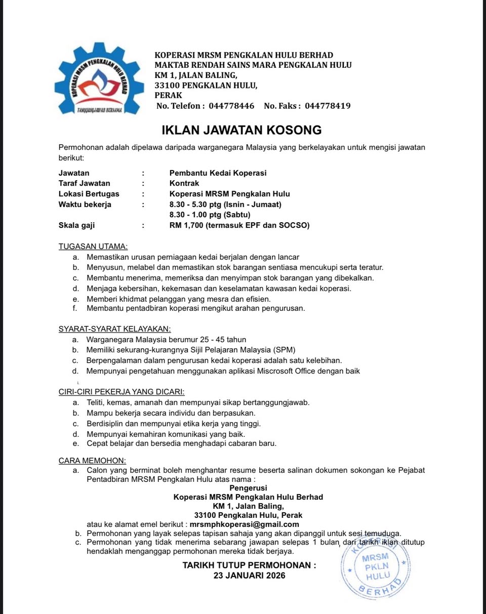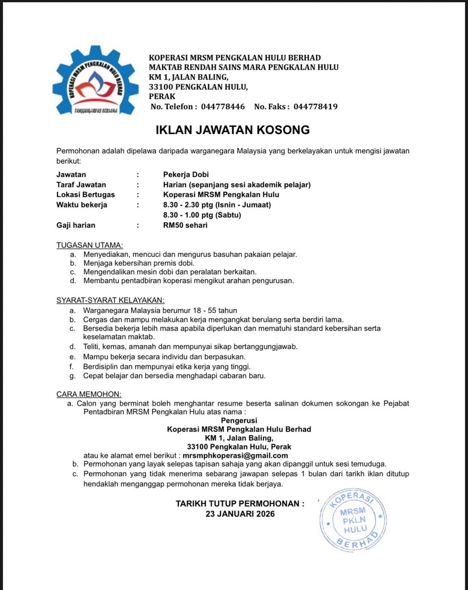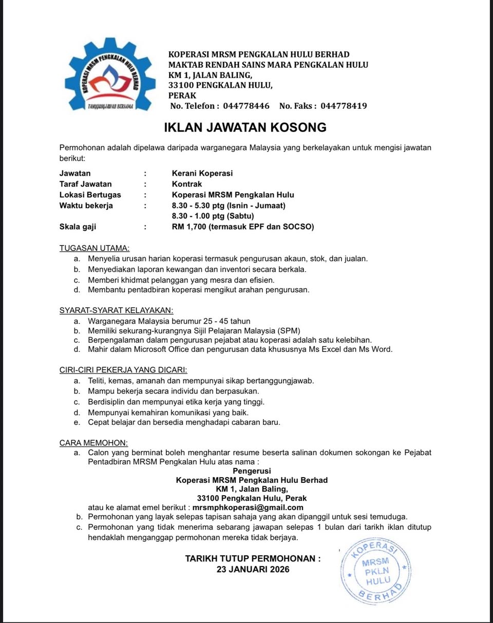 Iklan Kini Maktab Rendah Sains MARA (MRSM) Pengkalan Hulu ~ Kekosongan Pelbagai Jawatan Klik Iklan Jawatan Disini