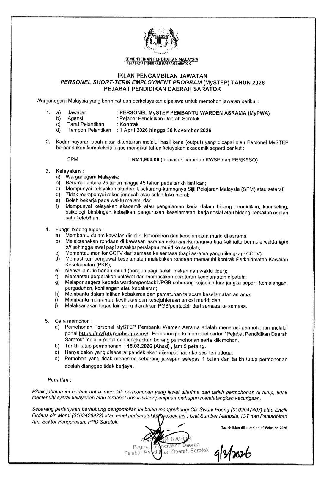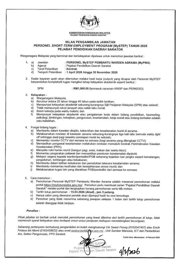 Iklan Kini Pejabat Pendidikan Daerah Saratok ~ Personel MySTEP