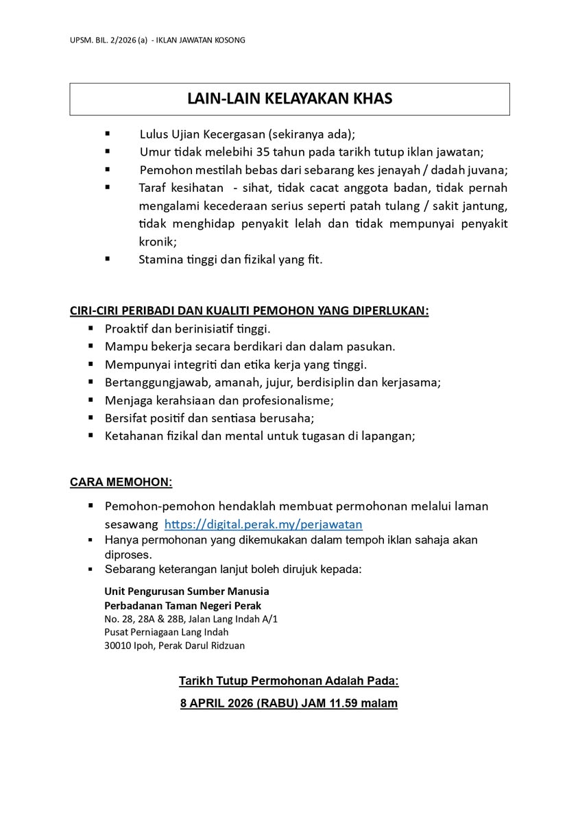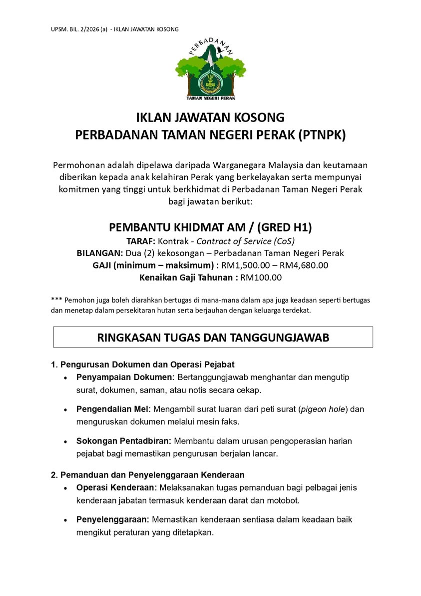 Iklan Kini Perbadanan Taman Negeri Perak ~ Kekosongan Jawatan Pembantu Khidmat Am Klik Iklan Jawatan Disini