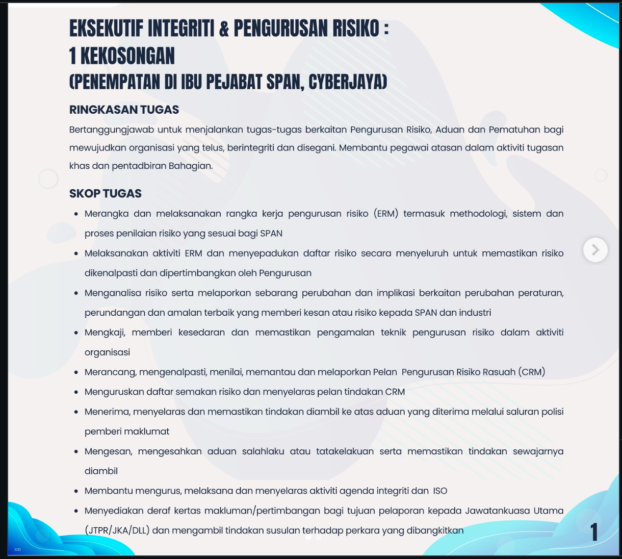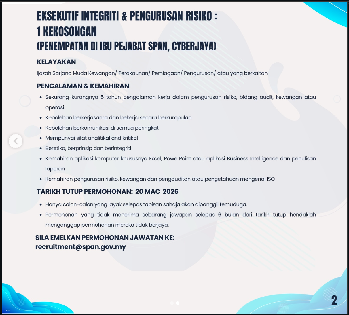 Iklan Kini Suruhanjaya Perkhidmatan Air Negara (SPAN) ~ Kekosongan Jawatan Eksekutif Integriti Dan Pengurusan Risiko Klik Iklan Jawatan Disini