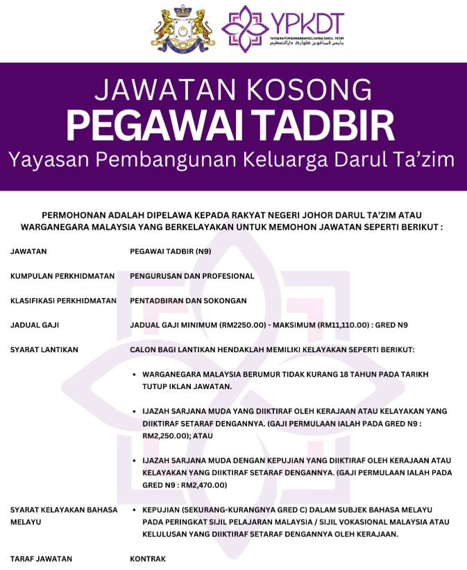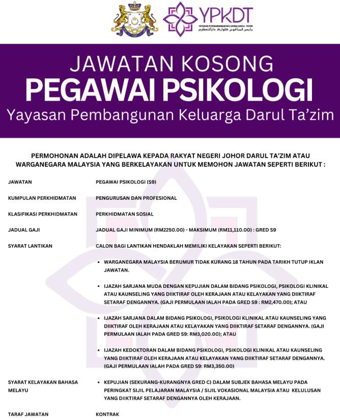 Iklan Kini Yayasan Pembangunan Keluarga Darul Ta’zim ~ Jawatan Kosong Pegawai Tadbir Gred N9 & Pegawai Psikologi Gred S9 Klik Iklan Jawatan Disini