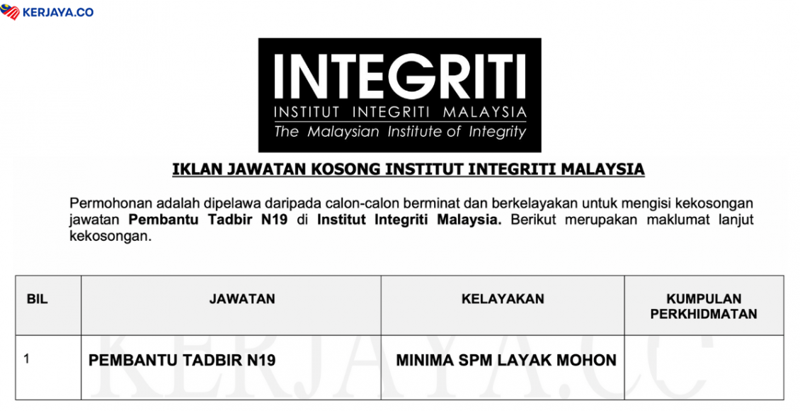 Pembantu Tadbir N19 di Institut Integriti Malaysia / SPM Tanpa Pengalaman Layak Mohon