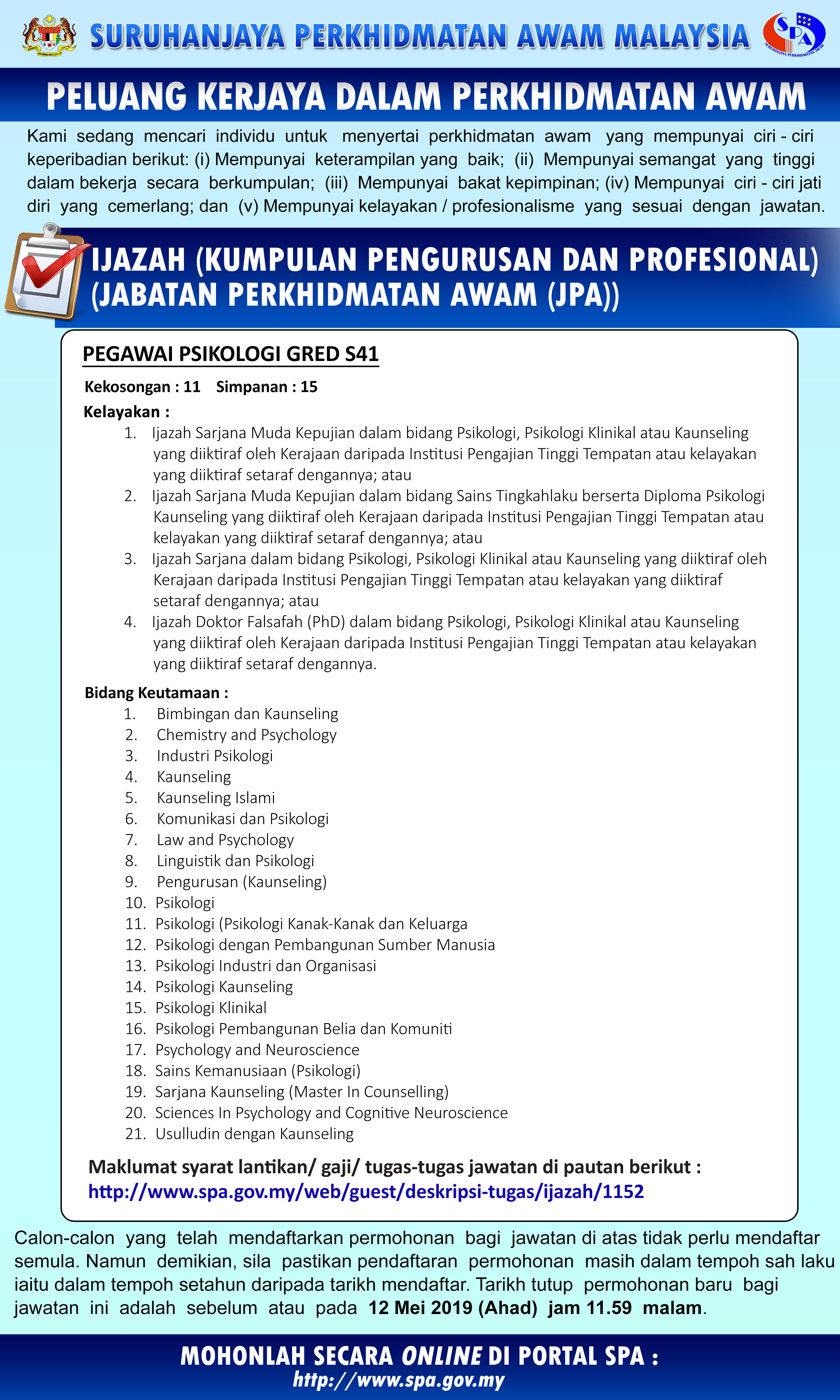 Sekiranya anda, seorang Warganegara Malaysia yang cukup syarat kelayakan dan berumur tidak kurang daripada 18 tahun pada tarikh tutup iklan jawatan adalah dipelawa untuk memohon bagi mengisi kekosongan jawatan tetap atau kontrak yang diiklankan.