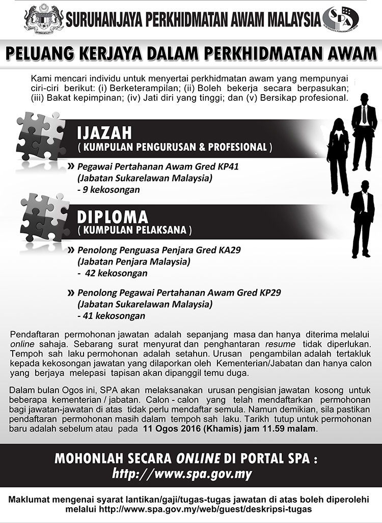 Suruhanjaya Perkhidmatan Awam Malaysia (SPA Malaysia) mempelawa calon berkelayakan dan memenuhi syarat-syarat yang ditetapkan untuk memohon mengisi kekosongan kerja seperti yang diiklankan di bawah: