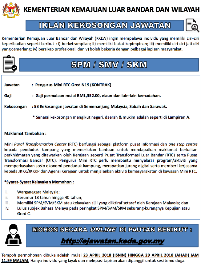 Sekiranya anda, seorang Warganegara Malaysia yang cukup syarat kelayakan dan berumur tidak kurang daripada 18 tahun pada tarikh tutup iklan jawatan adalah dipelawa untuk memohon bagi mengisi kekosongan jawatan tetap atau kontrak yang diiklankan.