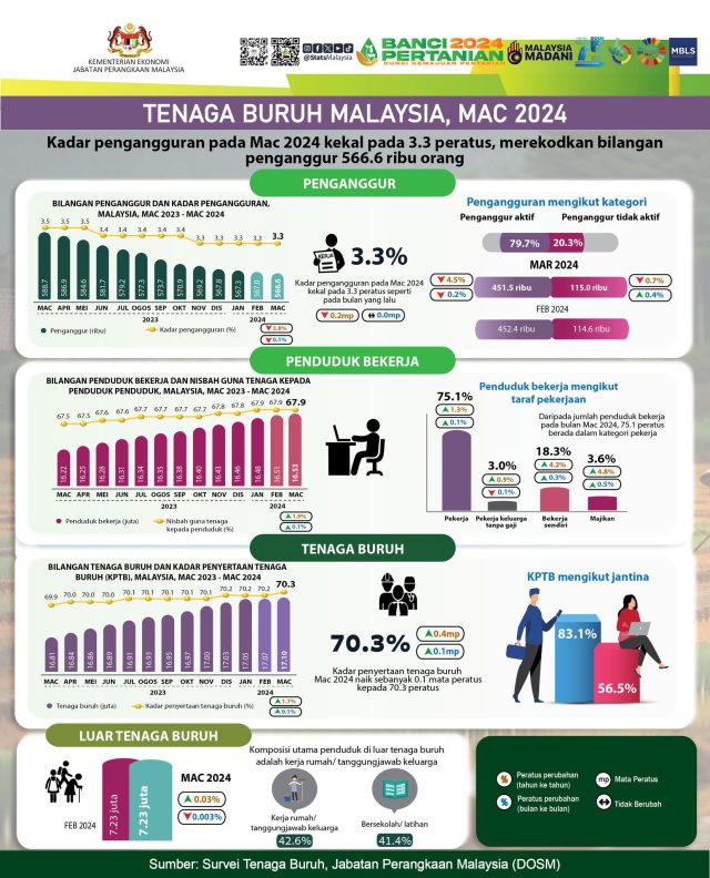 Bilangan penganggur pada Mac 2024 menunjukkan penurunan sebanyak 0.1% berbanding 567,000 orang pada Februari 2024. Kedudukan ekonomi yang menggalakkan pada bulan Mac 2024 telah membolehkan pasaran buruh negara untuk mengekalkan pertumbuhan yang stabil.