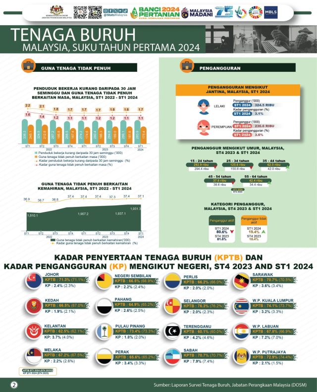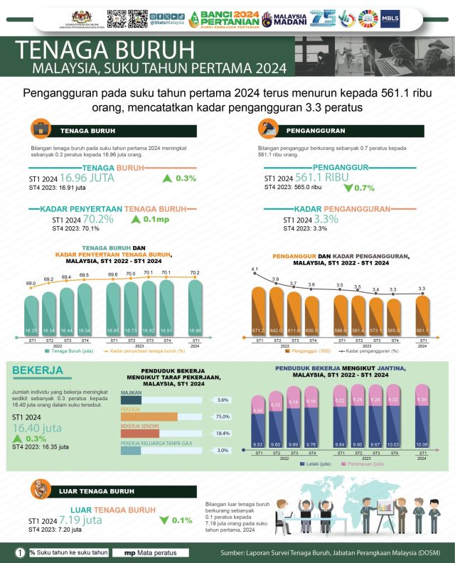 Bilangan tenaga buruh pada Mac 2024 terus mengukuh sebanyak 0.1% merekodkan 17.1 juta orang berbanding 17.07 juta orang pada Februari 2024. Kadar penyertaan tenaga buruh meningkat sebanyak 0.1 mata peratus kepada 70.3% (berbanding 70.2% pada Februari 2024), menunjukkan penyertaan buruh yang lebih tinggi dalam pasaran.