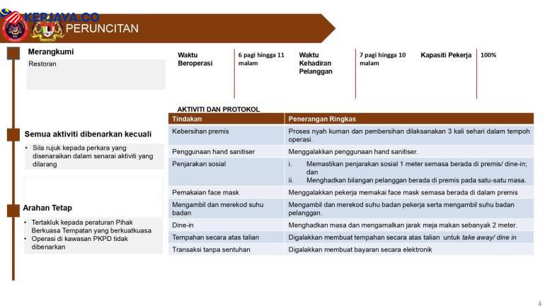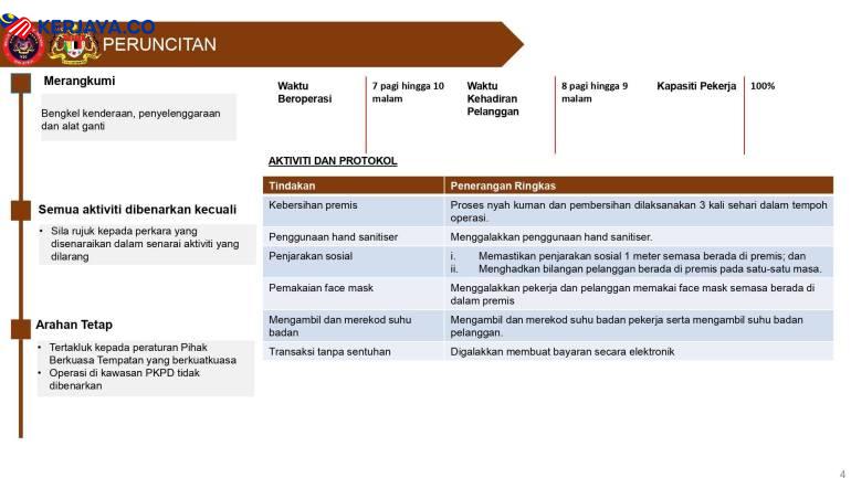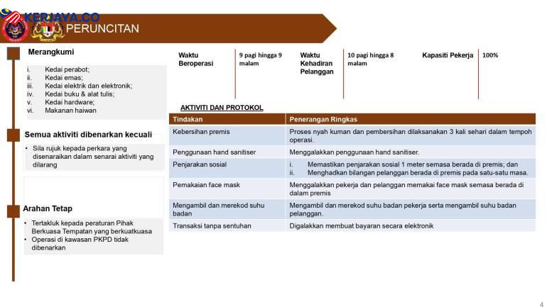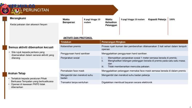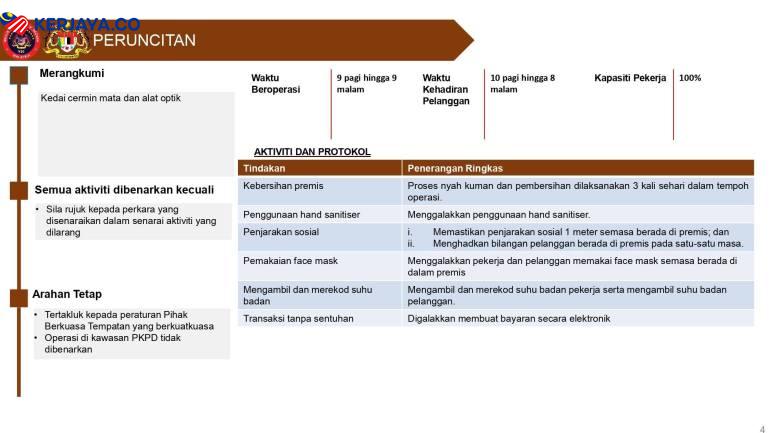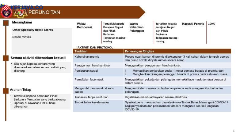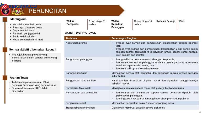 Berikut merupakan syarat-syarat dan SOP lengkap yang perlu diikuti oleh semua di dalam sektor peruncitan mengikut pecahan kepada 8 bahagian.