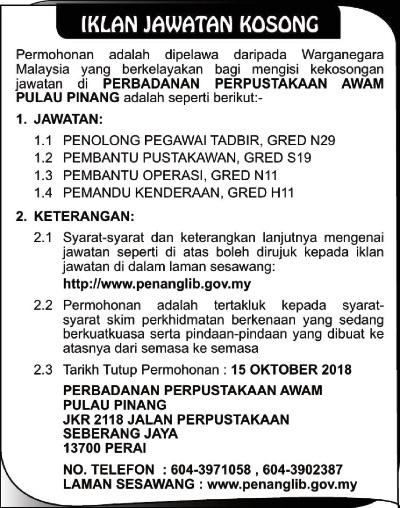 Jawatan Kosong Terkini Perbadanan Perpustakaaan Awam Pulau Pinang.