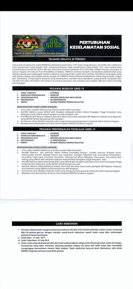 Permohonan Jawatan Kosong Pertubuhan Keselamatan Sosial (PERKESO).