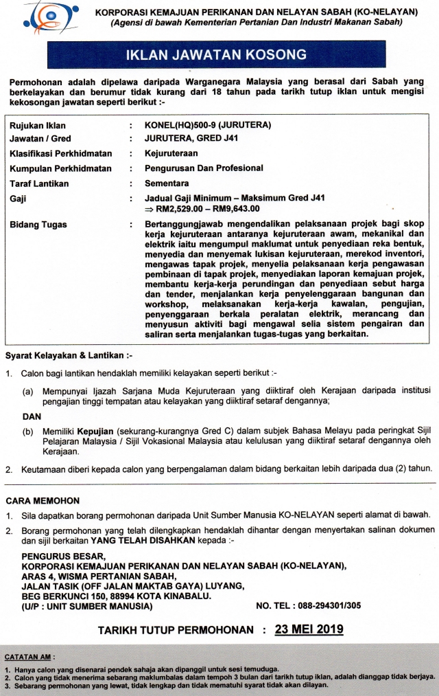 - Tarikh Tutup Permohonan: 23 Mei 2019