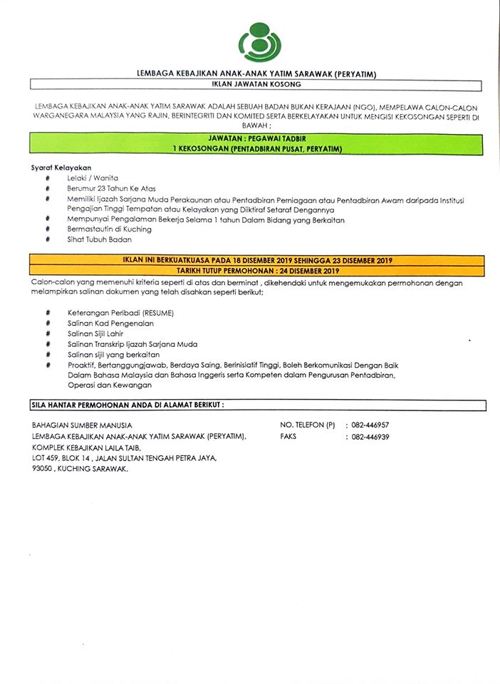 - Nama Majikan: Lembaga Kebajikan Anak-Anak Yatim Sarawak (PERYATIM)