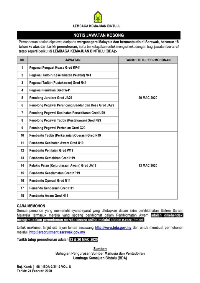 Permohonan Jawatan Kosong Lembaga Kemajuan Bintulu.