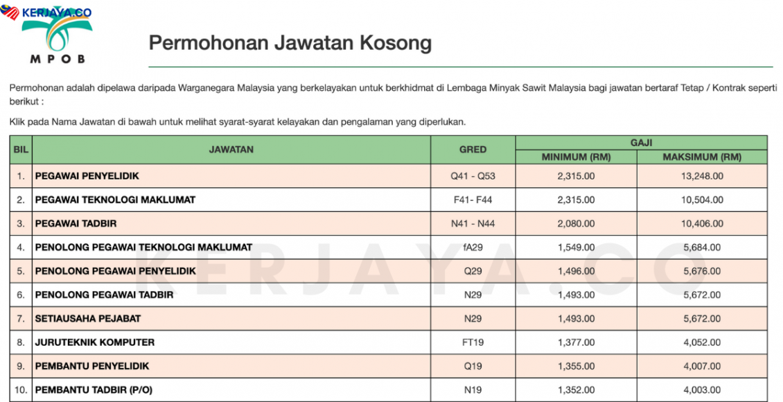 - Nama Majikan: Lembaga Minyak Sawit Malaysia (MPOB)